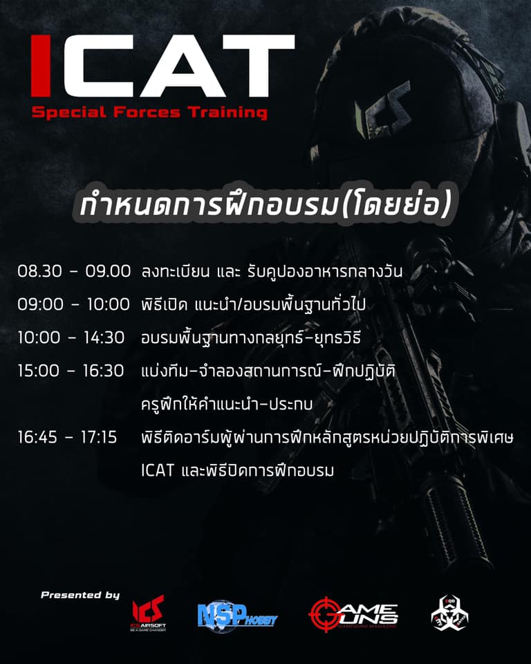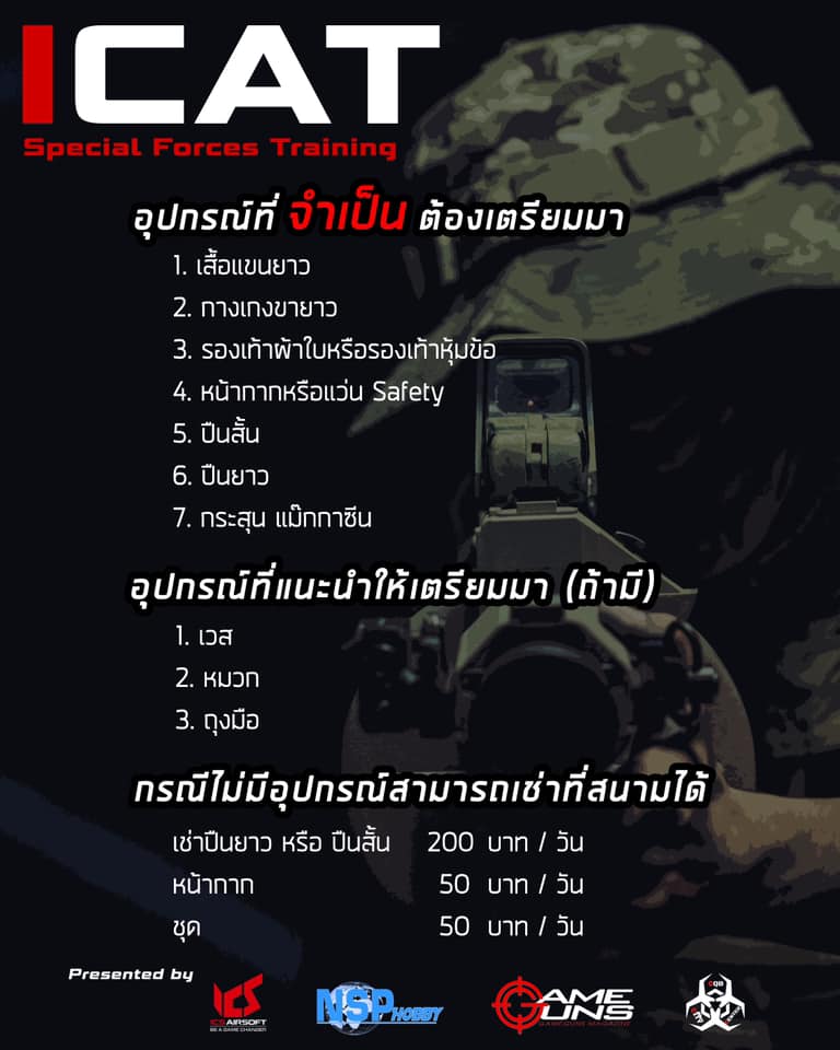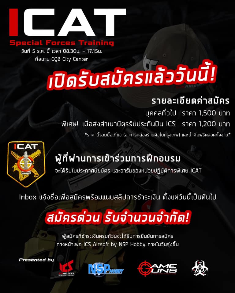 วันพฤ ที่ 5 ธ.ค. 2562 ณ สนาม CQB City Center MAPโดยการฝึกอบรมครั้งนี้ ICS Airsoft ได้เชิญครูฝึกที่เป็นอดีตทหารอาชีพหน่วยรบพิเศษที่เคยออกปฏิบัติภารกิจจริงมาแล้ว มาเป็นผู้ออกแบบการฝึก และออกแบบสถาณการณ์จำลองเสมือนจริง เพื่อนำเทคนิคที่ได้ไปเล่นในเกมส์แอร์ซอฟท์ได้อย่างสนุกสนานยิ่งๆ ขึ้นสามารถ Inbox มาสมัครทางเพจ ICS Airsoft by NSP Hobby ได้แล้วตั้งแต่วันนีเป็นต้นไป